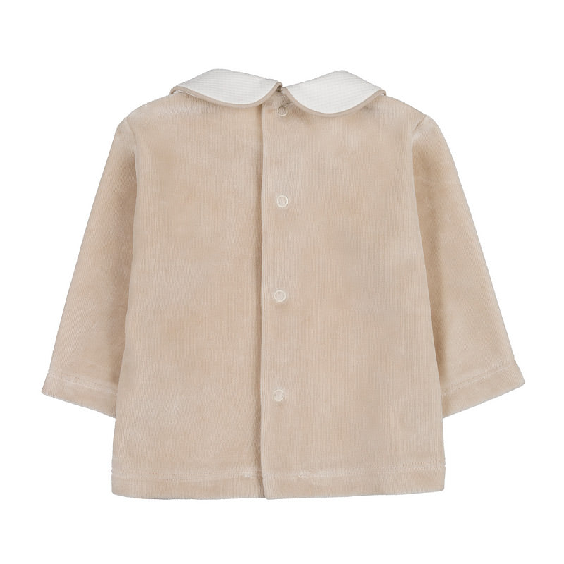 Graziosa tutina due pezzi in piquet con colletto con piping, impreziosita dalla presenza della 'n' ricamata davanti.
