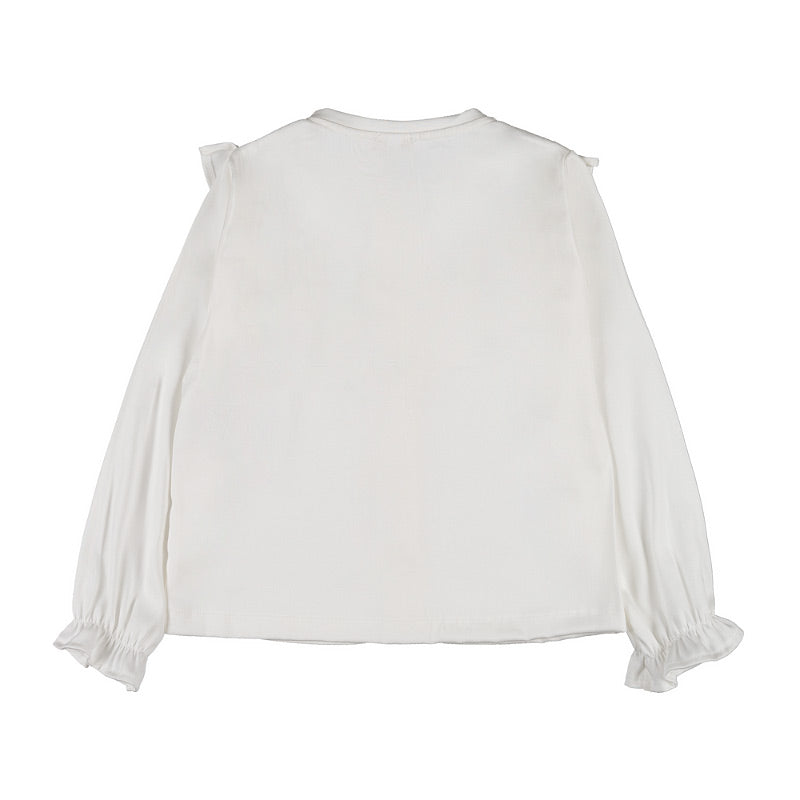 Elegante e raffinata, questa camicia a maniche lunghe è pensata per aggiungere un tocco di stile al guardaroba di ogni bambina. Il design è impreziosito da delicati volant sul davanti che donano movimento e romanticismo al capo. I bottoncini frontali in tono garantiscono una chiusura pratica mantenendo un look armonioso e curato. Le maniche terminano con una morbida arricciatura grazie all’elastico al polso, per una vestibilità comoda e un effetto leggermente sblusato.