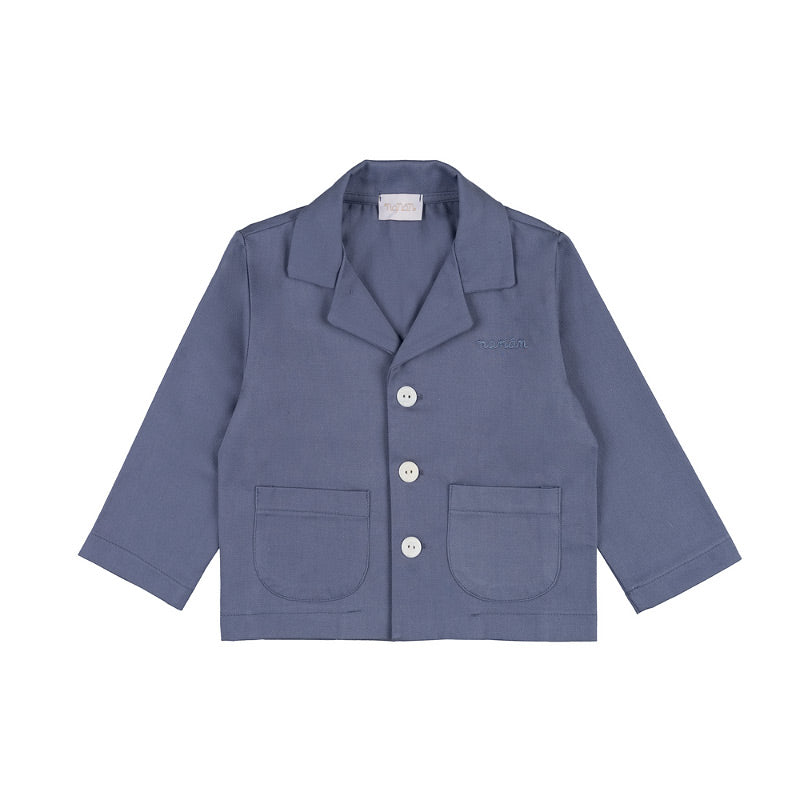 Un capo elegante e comodo, perfetto per le occasioni speciali o per aggiungere un tocco di classe al guardaroba quotidiano. Dotata di rever classico, chiusura frontale con bottoni chiari e due tasche applicate, è impreziosita dal ricamo “Nanán” tono su tono sul petto.