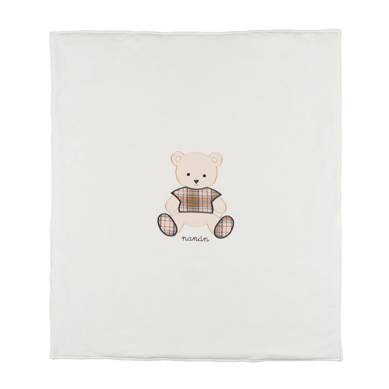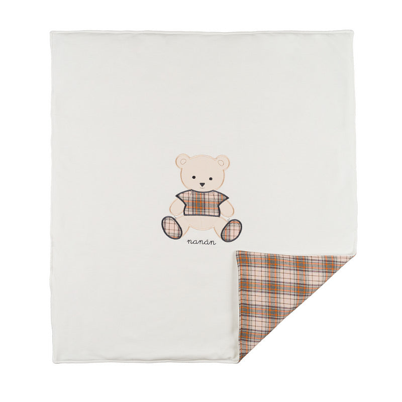 Una coccola di calore e dolcezza per il tuo neonato. Questa copertina firmata Nanán è realizzata in color panna e l'interno è in fantasia scozzese. Le dimensioni compatte la rendono perfetta per carrozzina, culla o passeggino. Il design è impreziosito da un raffinato ricamo orsetto. Morbida, avvolgente e ideale per le stagioni fredde.
