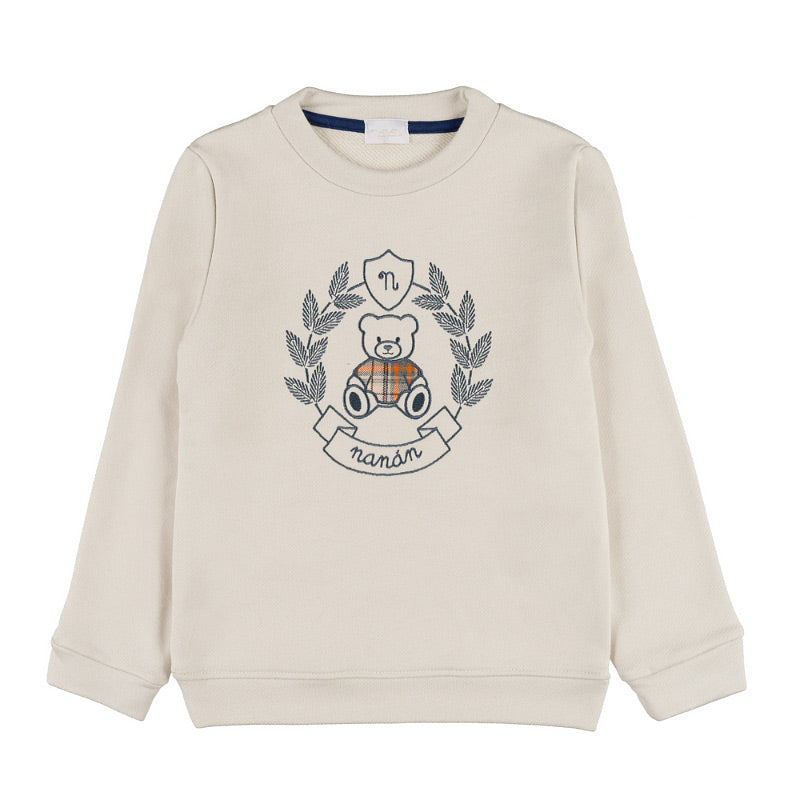Questa felpa unisce comfort e tenerezza in un capo pensato per i più piccoli. Presenta un’adorabile stampa ricamata con orsetto al centro, impreziosita da una corona d’alloro e uno stemma con la lettera "N", simbolo del marchio.