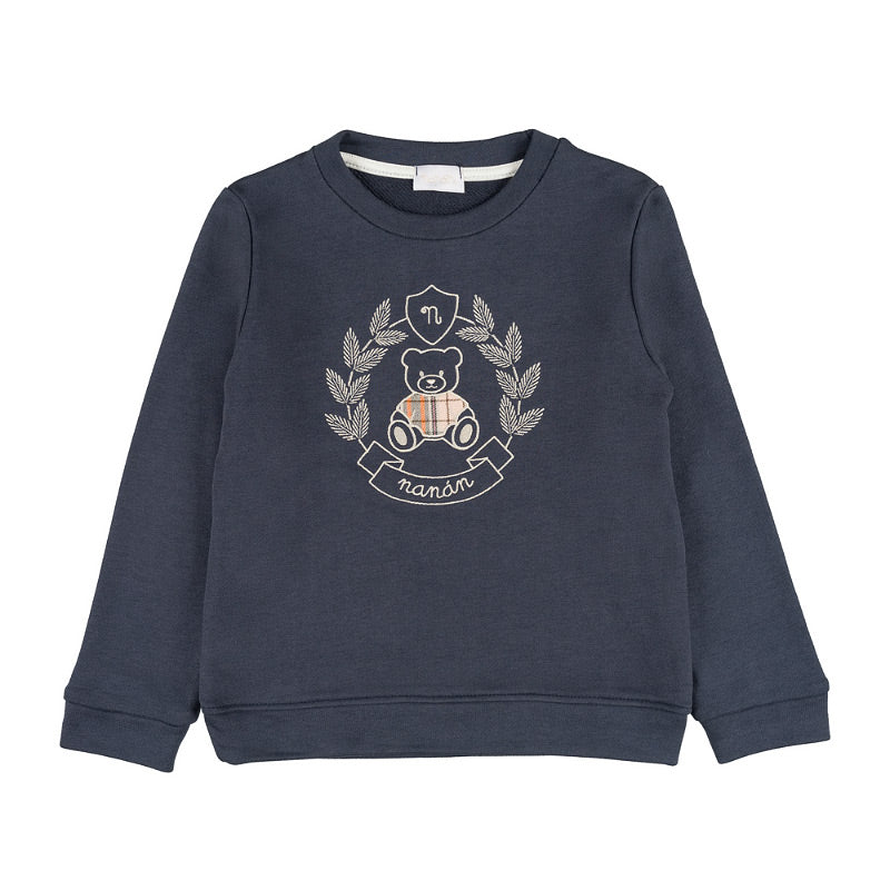 Questa felpa unisce comfort e tenerezza in un capo pensato per i più piccoli. Presenta un’adorabile stampa ricamata con orsetto al centro, impreziosita da una corona d’alloro e uno stemma con la lettera "N", simbolo del marchio.