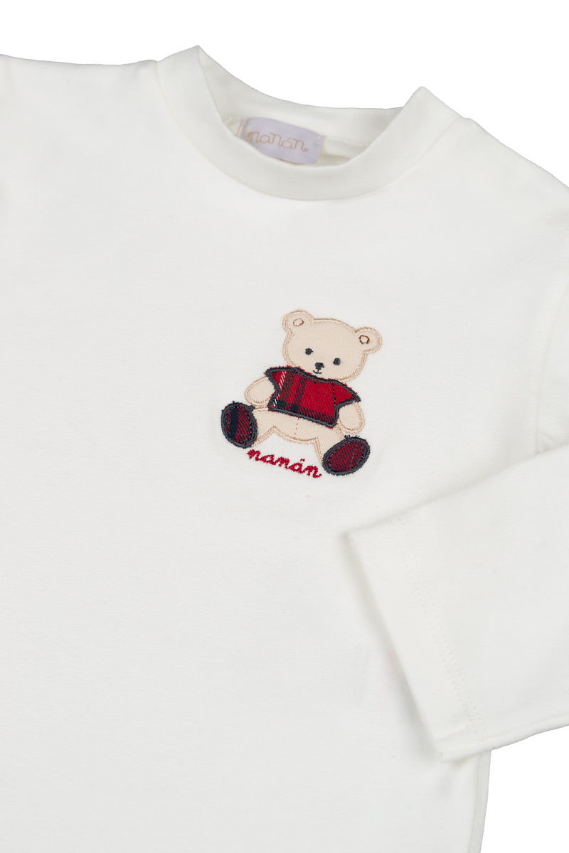 Questo dolcevita bianco è perfetto per tenere al caldo i più piccoli con stile e comfort. Realizzato in morbido cotone, presenta una simpatica grafica laterale di un orsetto che indossa una maglia scozzese, un dettaglio dolce e colorato che rende il capo unico e divertente.
