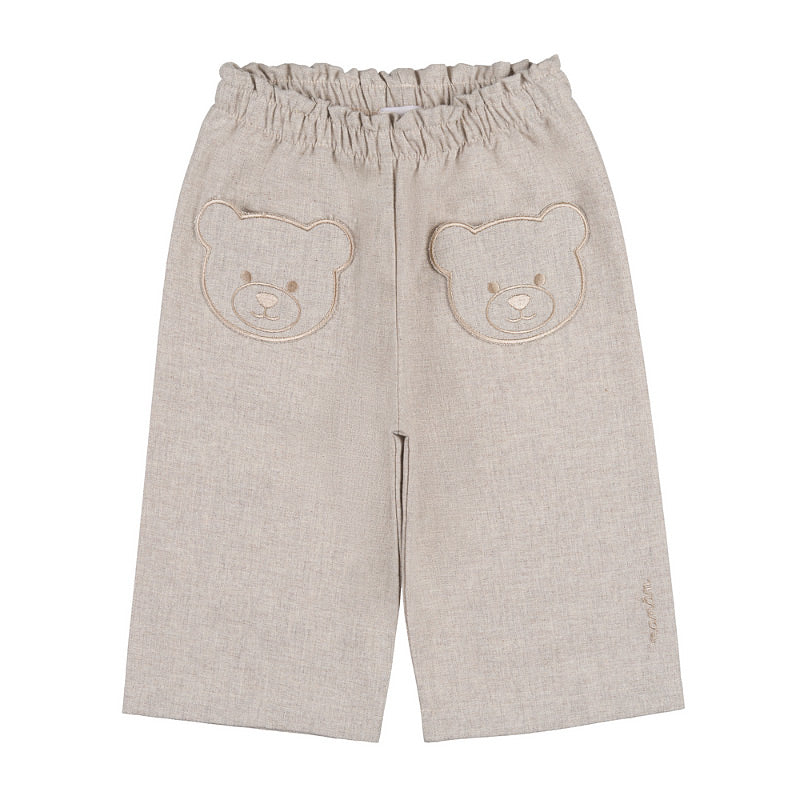 Comodi, teneri e super pratici! Questi pantaloni morbidi beige sono perfetti per accompagnare le bambine in ogni momento della giornata. Le tasche frontali a forma di orsetto aggiungono un tocco giocoso e dolcissimo al look, mentre la vita elasticata assicura una vestibilità facile e confortevole.