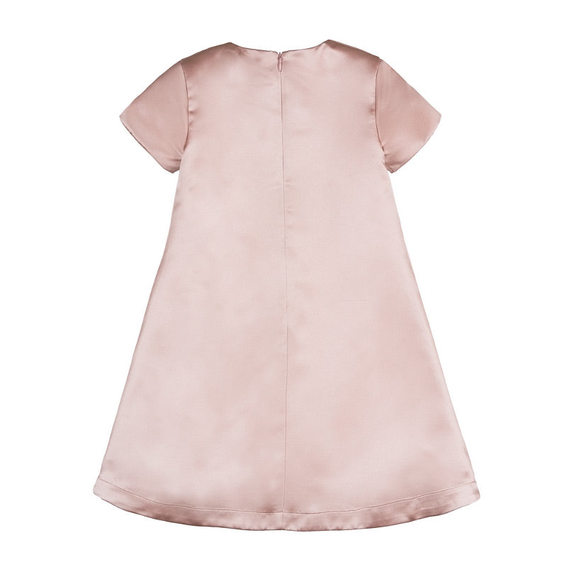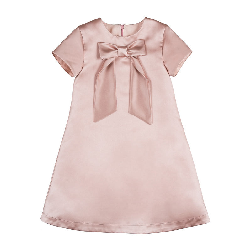 Abito rosa in raso smanicato con fiocco