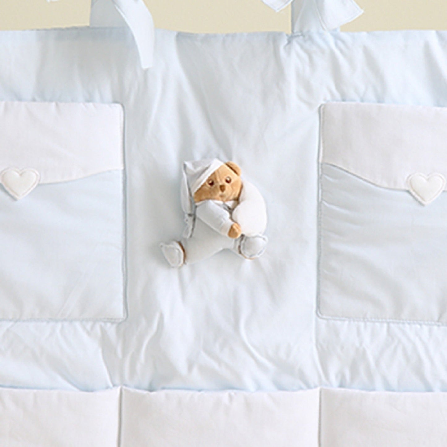 Il pannello portaoggetti Nanàn della linea Puccio, è un comodissimo pannello leggermente imbottito, con cinque comode tasche, in cui introdurre tutto il necessario per preparari alla nanna e la quotidianeità del tuo bebè. Utile per tenere sempre in ordine la cameretta, il pannello è facile da lavare. A renderlo ancora più dolce sono l'applicazione del dolce orsetto Puccio e piccoli cuoricini cuciti sulle tasche. A seconda del gusto personale può essere appeso al muro, sorretto da un'apposita asta (non inclusa), oppure al lettino del bimbo, per avere sempre tutto a portata di mano. Puccio è un tenero compagno del tuo bambino, e lo accompagna in ogni momento della sua giornata! Dimensioni: 60x65cm