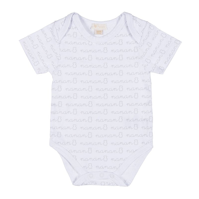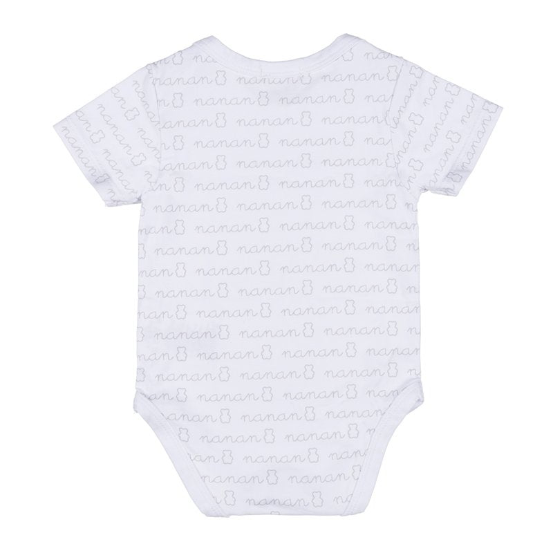 Graziosa confezione composta da due adorabili body a maniche corte azzurri e uno bianco, impreziositi da dolce scritta "Nanan" all over. Abbottonatura inferiore.