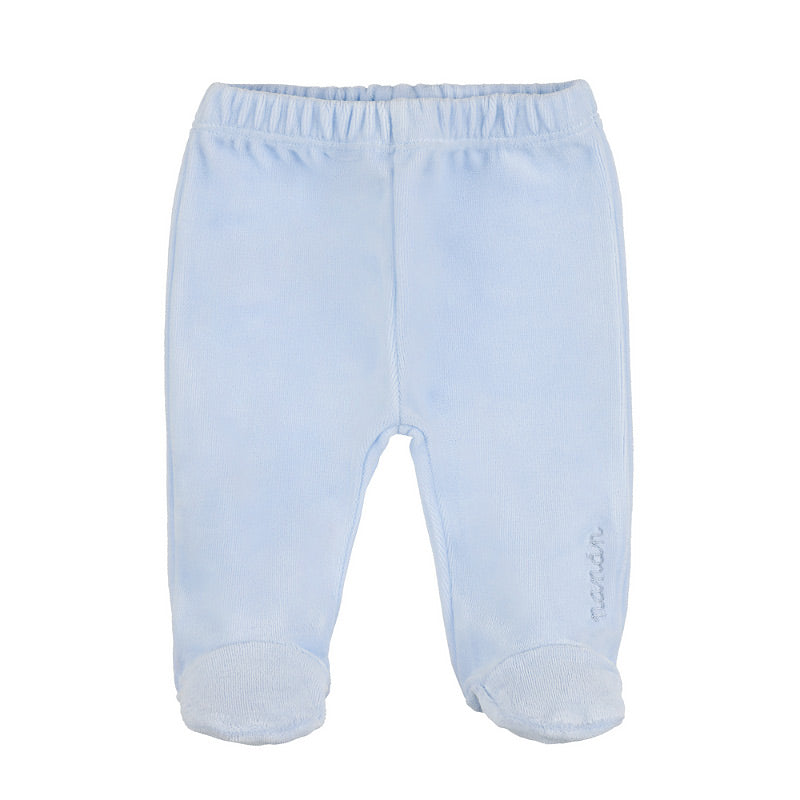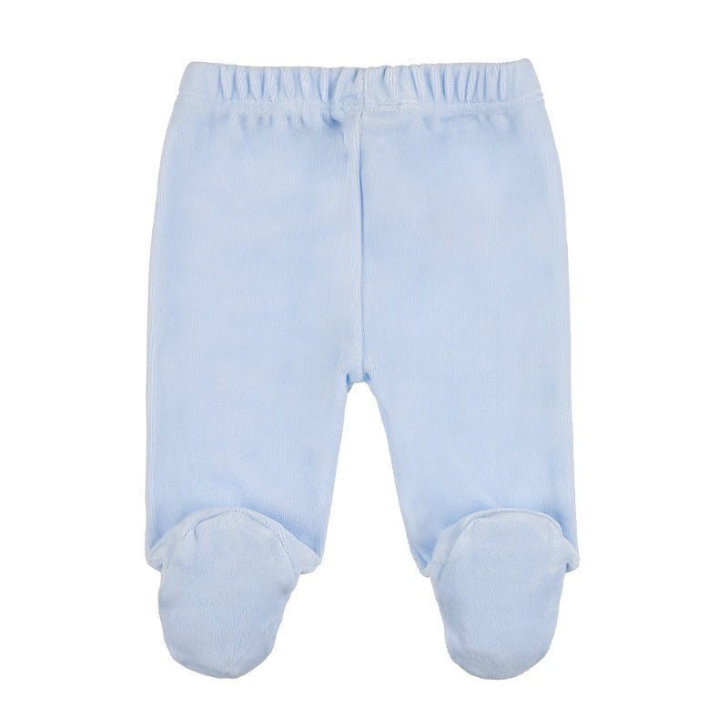 Tutina due pezzi in ciniglia. Maglia con colletto tondo e piping, rifinita con piccoli e graziosi ricami e apertura sul retro con bottoni a pressione. Pantalone con vita elastica.