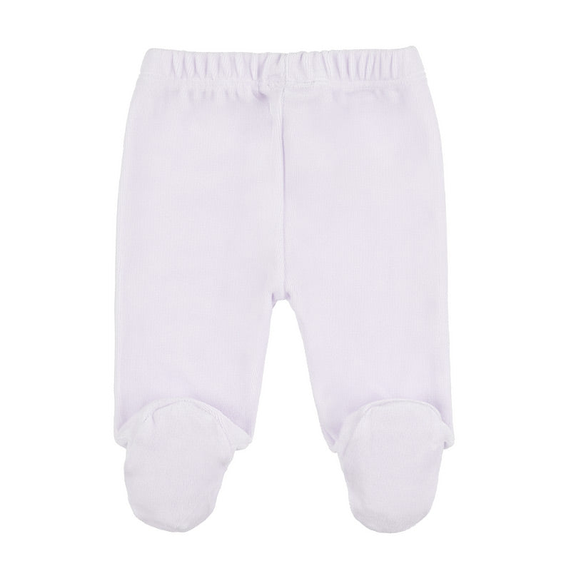 Tutina due pezzi in ciniglia. Maglia con colletto tondo e piping, rifinita con piccoli e graziosi ricami e apertura sul retro con bottoni a pressione. Pantalone con vita elastica.