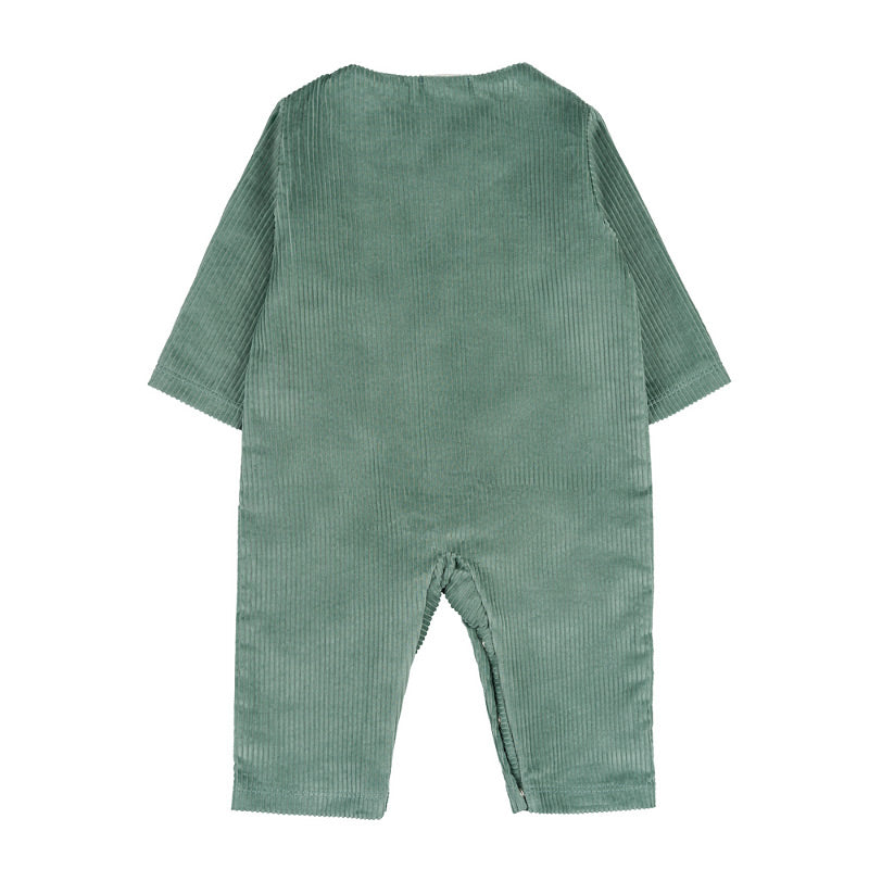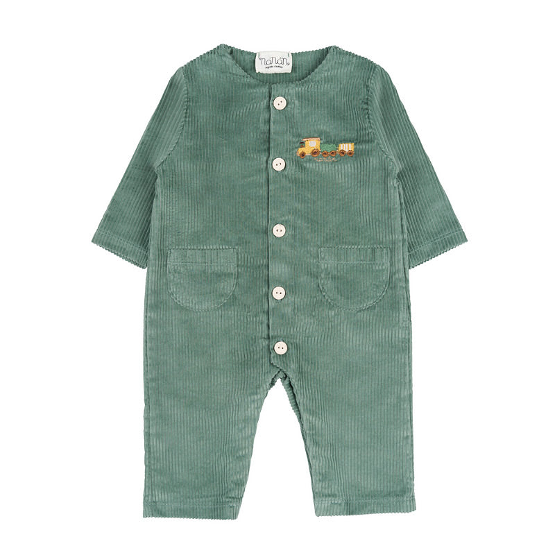 Tutina rifinita con ricamo di un trenino. Chiusura frontale con bottoni e tasche sul davanti.