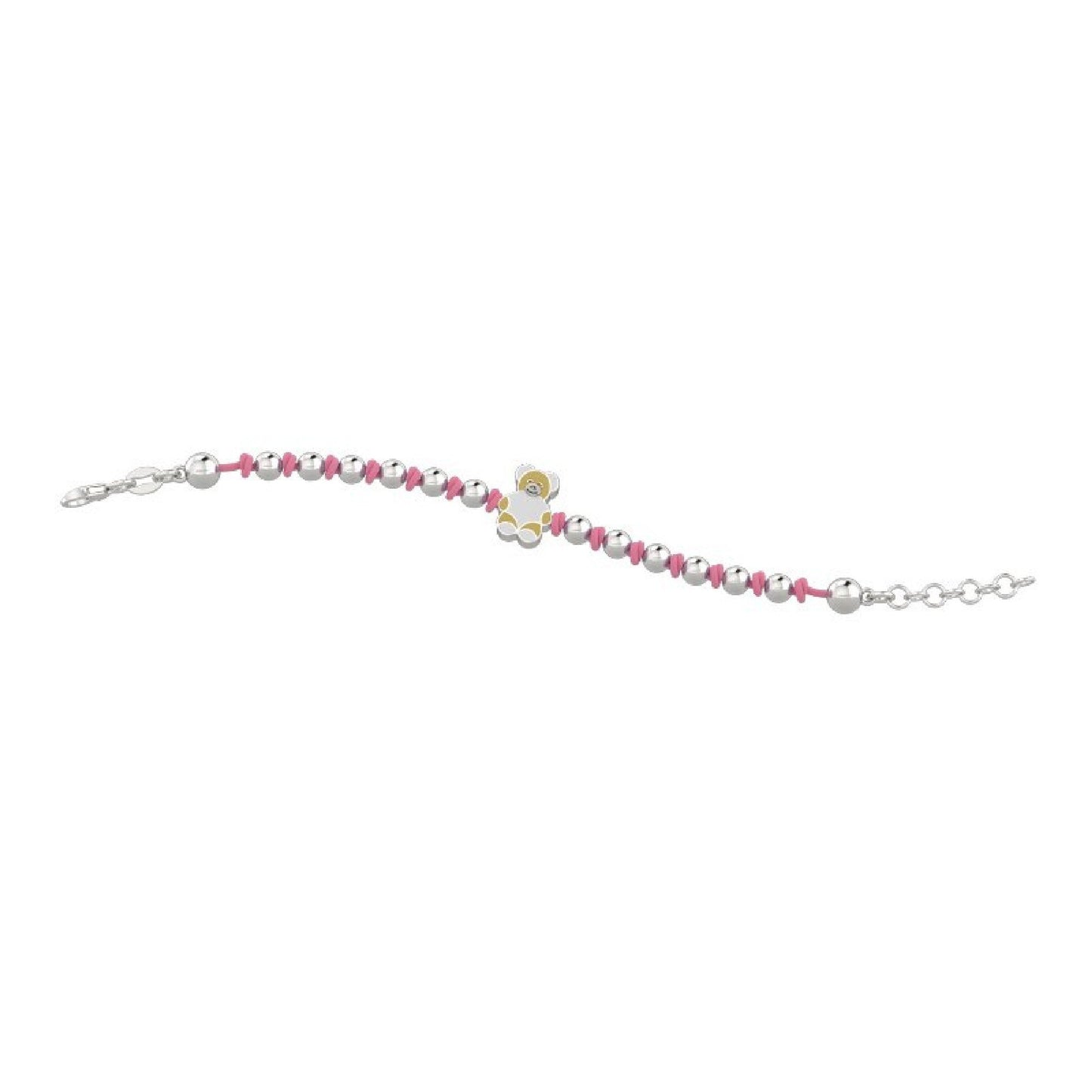Das Armband mit dem Teddybär mit kleinen Knoten und silbernen Perlen macht das Handgelenk Ihres Babys/Mädchens aus. In der rosa Farbe.