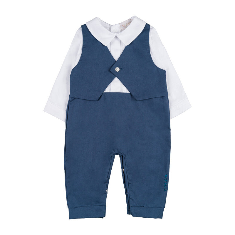 Bereiten Sie sich dank dieses raffinierten Jets darauf vor, die besonderen Momente mit Stil zu feiern. Ein einzigartiges Kleidungsstück, das Komfort und Klasse kombiniert, perfekt für Zeremonien, Taufen oder wichtige Anlässe. Das Design simuliert einen eleganten Anzug mit einem weißen, langen Hemd und einer gefälschten integrierten blauen Weste, die Praktikabilität und einen tadellosen Look bietet.