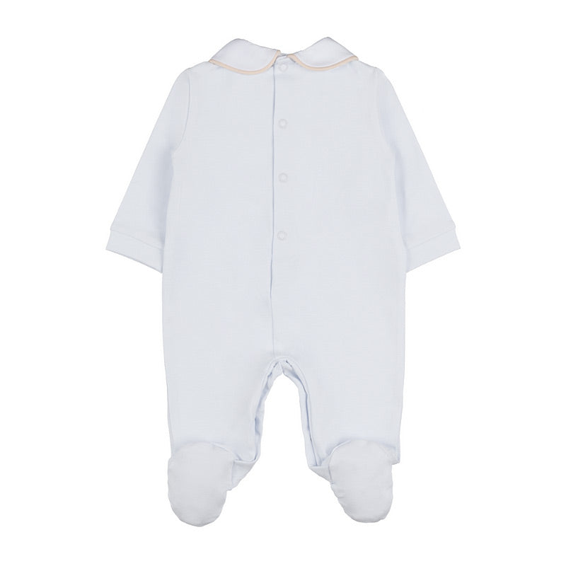 Baby-Strampler aus Bio-Baumwolljersey, verziert mit kleinen, hübschen Stickereien. Es verfügt über einen runden Kragen mit Paspelierung und eine Rückenöffnung mit Druckknöpfen.