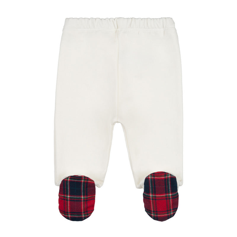 Süßer Playsuit, der Komfort und Stil in einem einzigen Kleidungsstück vereint. Das Kleidungsstück ist mit einem eleganten Kragen mit Schottenmuster verziert, der perfekt zu den Füßen passt und ebenfalls im gleichen Muster gehalten ist. Auf der Vorderseite befindet sich eine niedliche Grafik mit einem Bären, der ein passendes Tartan-T-Shirt trägt