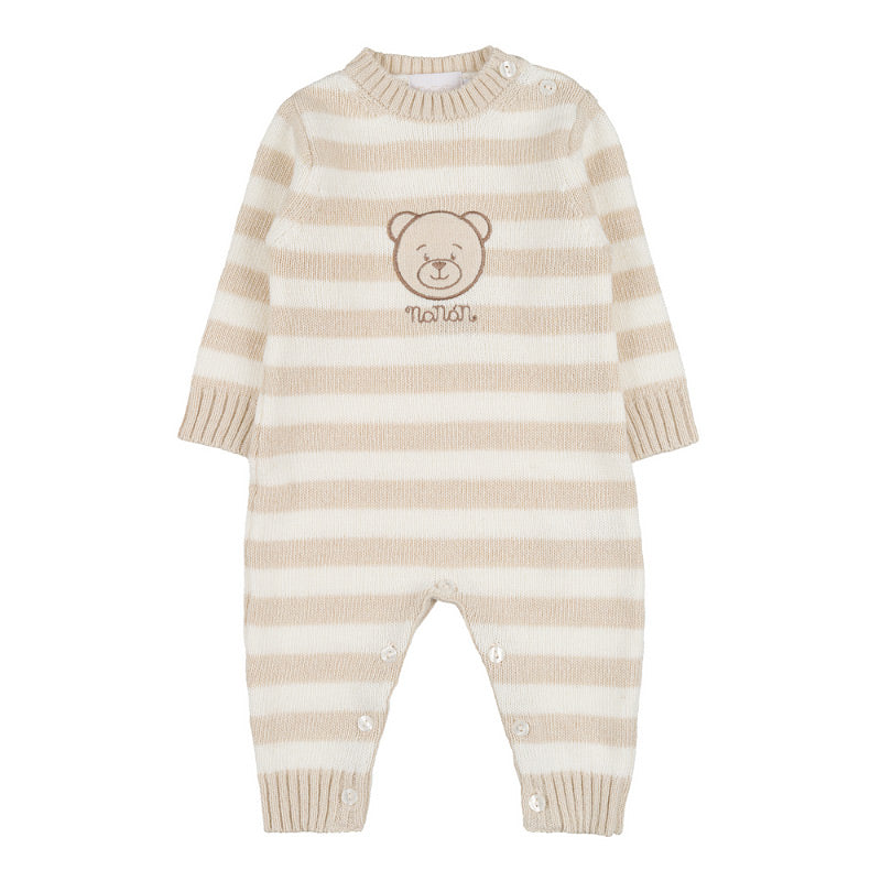 Graziosa tutina rigata beige, impreziosita da un tenero orsetto sul fronte.