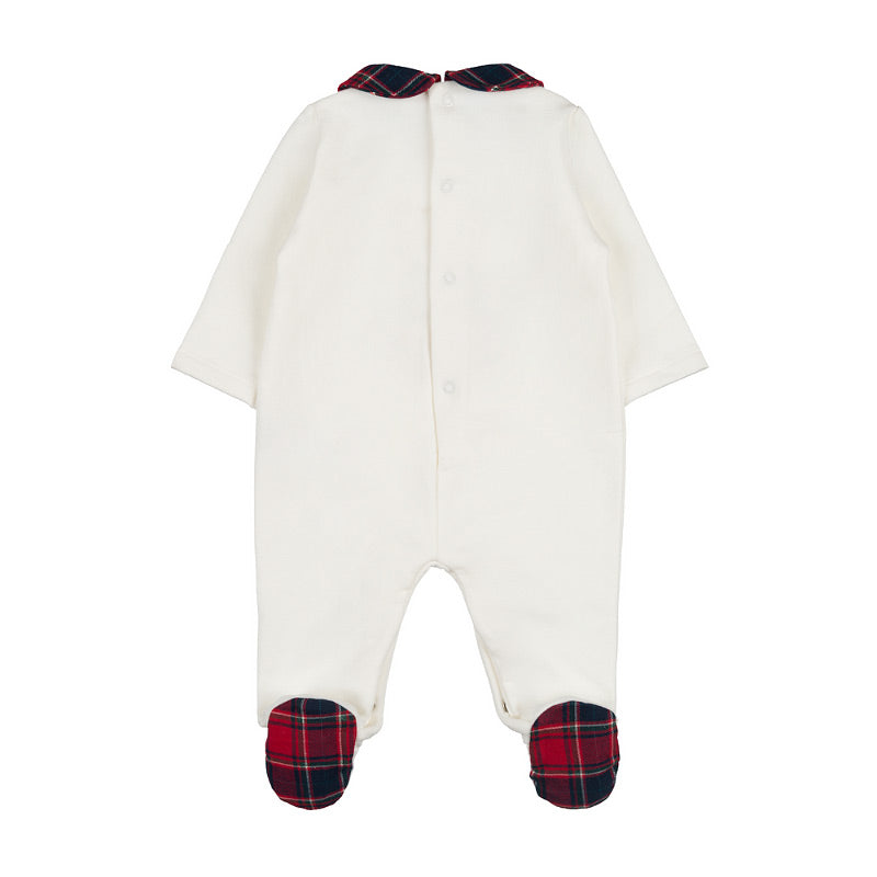 Dolcissima tutina pensata per unire comfort e stile in un unico capo. Il capo è impreziosito da un elegante colletto a fantasia scozzese in perfetto abbinamento con i piedini, anch'essi rifiniti nella stessa fantasia. Sul davanti è presente una tenera grafica con un orsetto che indossa una maglietta coordinata in tessuto scozzese.