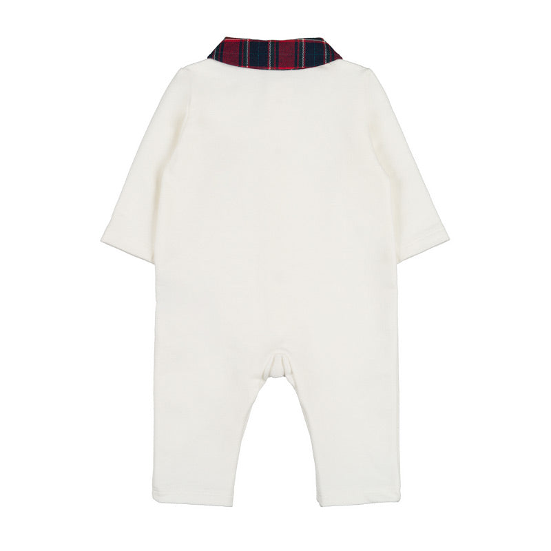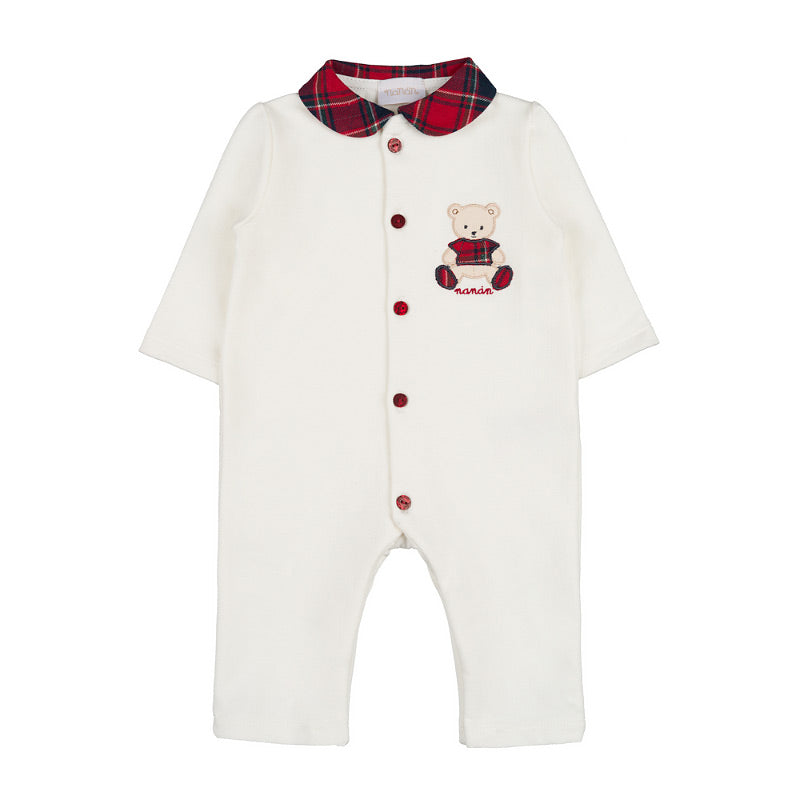Tenerissima tutina per neonato dal design originale e curato nei dettagli. Il capo è impreziosito da un elegante colletto in fantasia scozzese che richiama la maglietta dell’orsetto stampato lateralmente sul davanti, creando un delizioso effetto coordinato. La chiusura frontale con pratici bottoncini rossi dona un tocco di colore e rende la vestizione semplice e veloce.