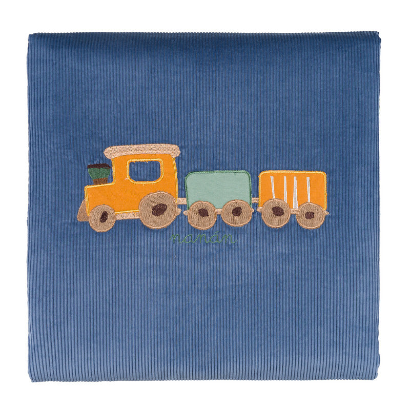 Morbida e avvolgente, questa copertina è realizzata in soffice velluto a costine, perfetta per coccolare il tuo bambino nei momenti di riposo. Al centro, un dolce ricamo raffigurante un trenino colorato dona un tocco giocoso e raffinato.
