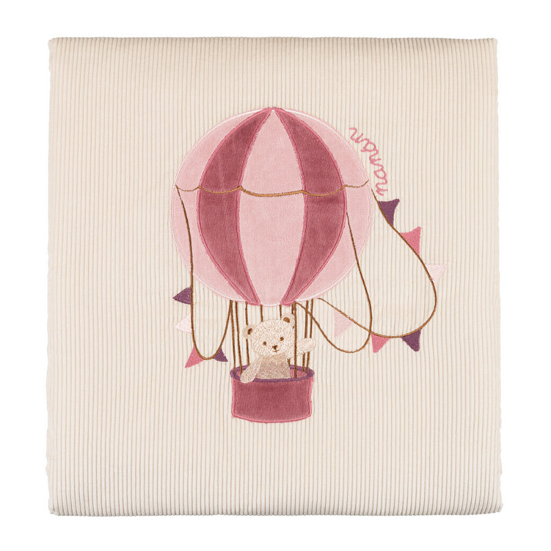 Wrap your little one in softness and tenderness with this ribbed blanket, made of a delicate and warm fabric, ideal for newborns' sensitive skin. The refined embroidery of a sweet little bear in a hot air balloon adds a touch of magic and sweetness, perfect for pampering your baby during moments of rest or a walk. An essential accessory to guarantee comfort and style in every season.