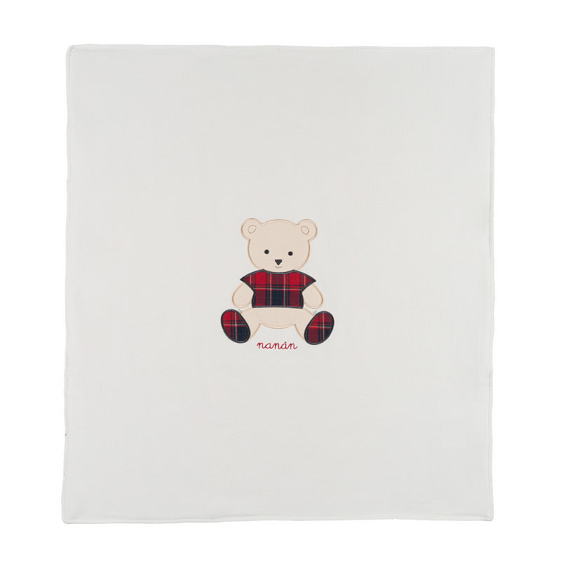 Wrap your little one in a warm hug with this sweet white blanket, decorated with the cute graphic of a bear wearing a colorful plaid shirt.