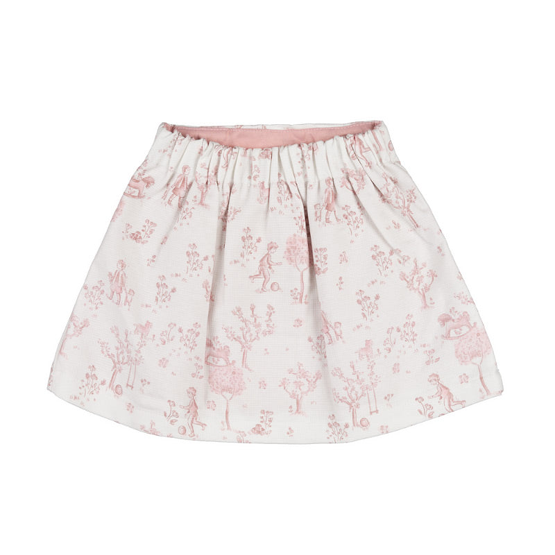 Elegance and sweetness meet in this splendid folder skirt. Made in a refined white fabric with a delicate toile de jouy printing depicting childish scenes with a vintage flavor, it is the ideal garment for romantic and timeless looks. The elastic band in life guarantees a comfortable and practical fit, perfect for accompanying every movement of your little girl.
