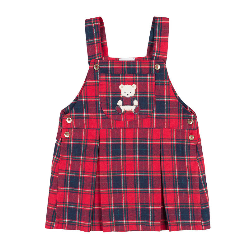This adorable dungare dress is perfect for the little ones who love to dress in style and comfort. Made of soft Scottish paint fabric, it has a practical front pocket decorated with a sweet graphic of a bear wearing a Scottish shirt, for a playful and original touch.