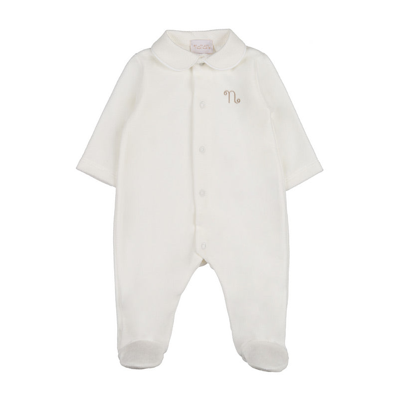 Graziosa tutina in piquet aperta davanti  con colletto con piping, impreziosita dalla presenza della 'n' ricamata davanti.