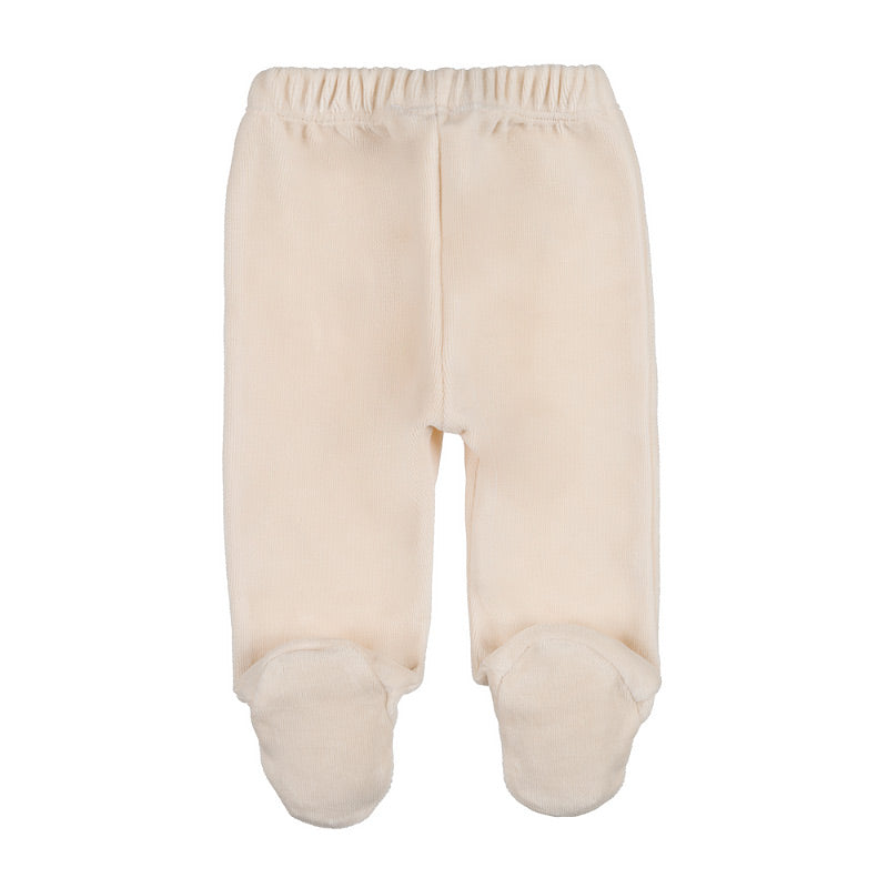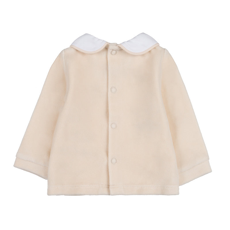Tutina due pezzi in ciniglia. Maglia con colletto tondo e piping, rifinita con il ricamo di dolci orsetti e apertura sul retro con bottoni a pressione. Pantalone con vita elastica.