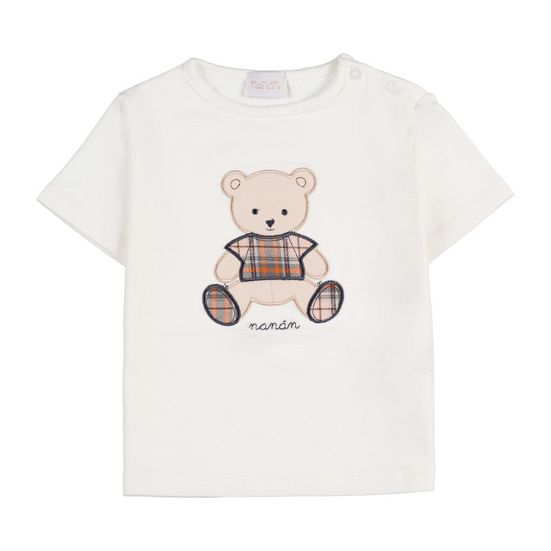A t-shirt designed to pamper your baby with style. Made of cotton, this long -sleeved shirt is perfect for the cooler seasons. The simple design is embellished with a central embroidery with the tender Nanán bear, decorated with details in Orange/Gray Scottish fabric for a refined touch. Closure with pressure buttons on the shoulder to facilitate dressing.