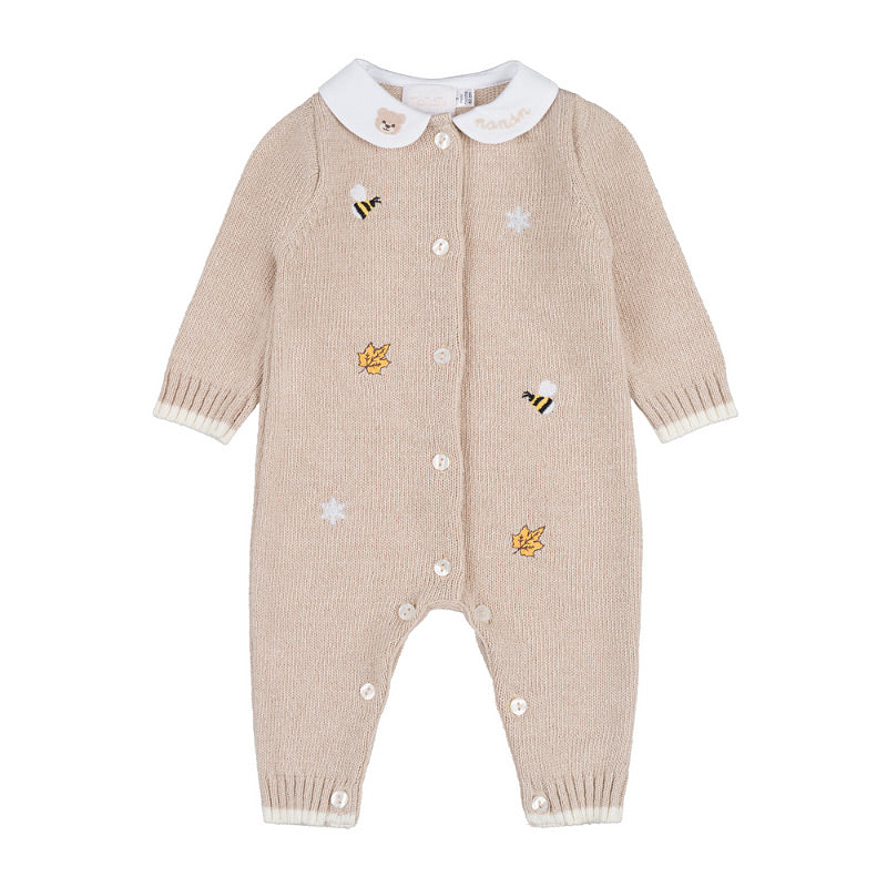 Tutina da bebè in filo, rifinita da piccoli e graziosi ricami. Presenta un colletto tondo e un'apertura frontale con bottoni color madreperla.