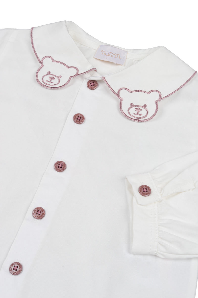 Delightful long-sleeved shirt, embellished with a large white round collar with two teddy bears embroidered with elegant colored finishes that give a romantic and refined touch. The front closure is completed with pretty buttons. Ideal for special occasions or to add a chic touch to your everyday wardrobe.