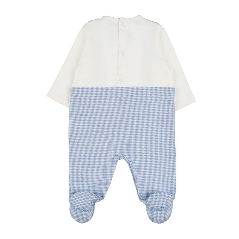 Precio regular €51,20Graziosa tutina con bretelle e papillon in pied de poule azzurro della collezione “Pastelli boy”. Apertura posteriore e inferiore.