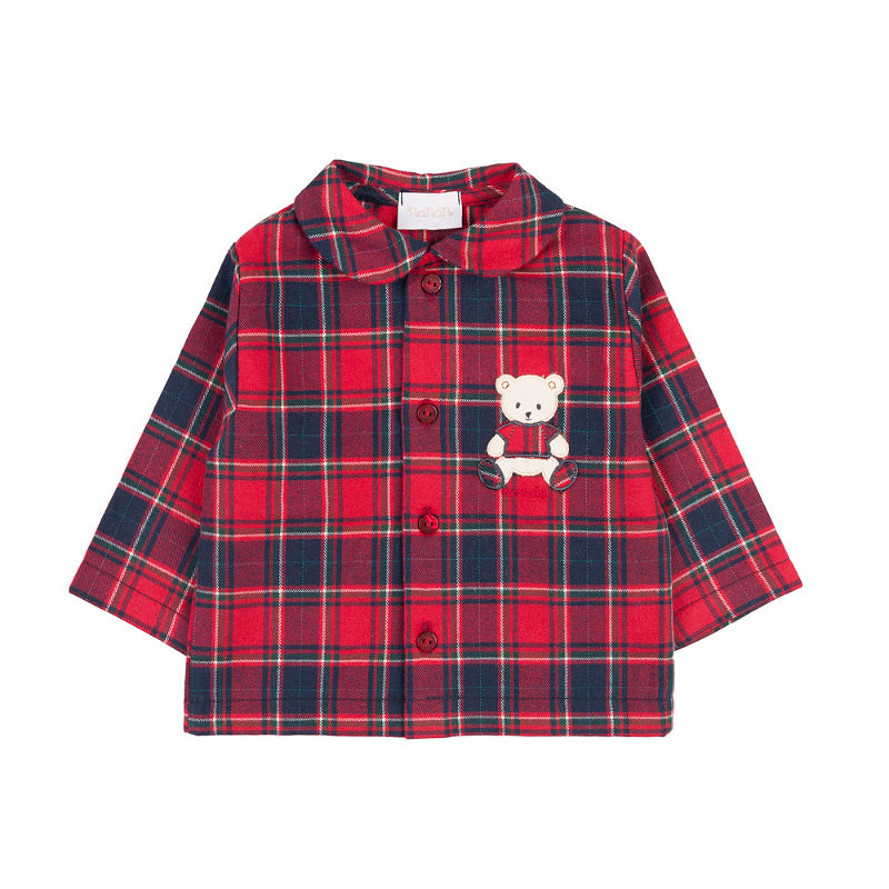 Pijama de dos piezas de estilo clásico y refinado. La camisa de manga larga presenta un cuello elegante y un lindo gráfico de osito de peluche impreso en el costado, para darle un toque afectuoso y divertido. El cierre frontal se vuelve práctico y colorido gracias a una hilera de botones rojos en contraste.