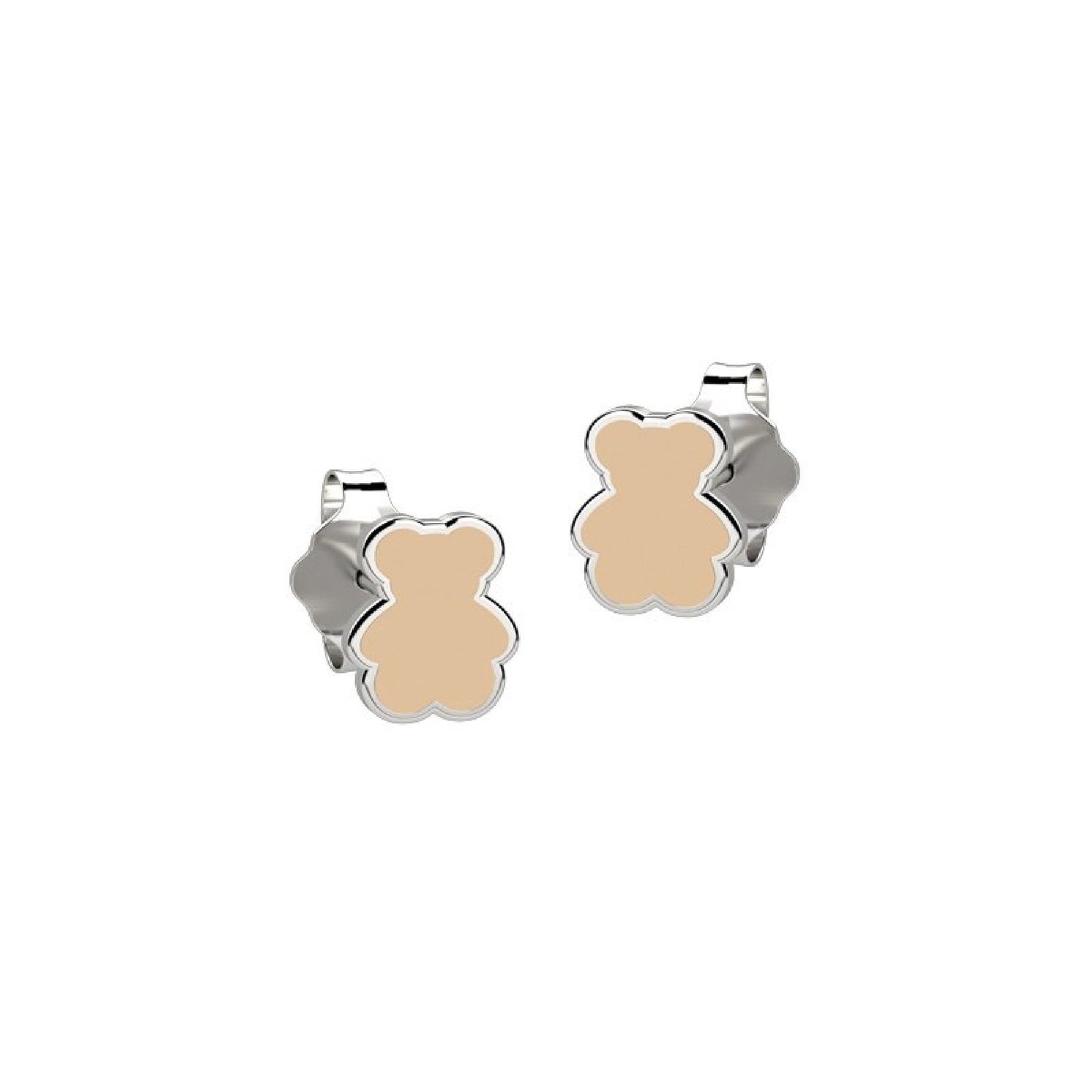 Par de aretes de color crema, en forma de osos pequeños, con bordes de plata.