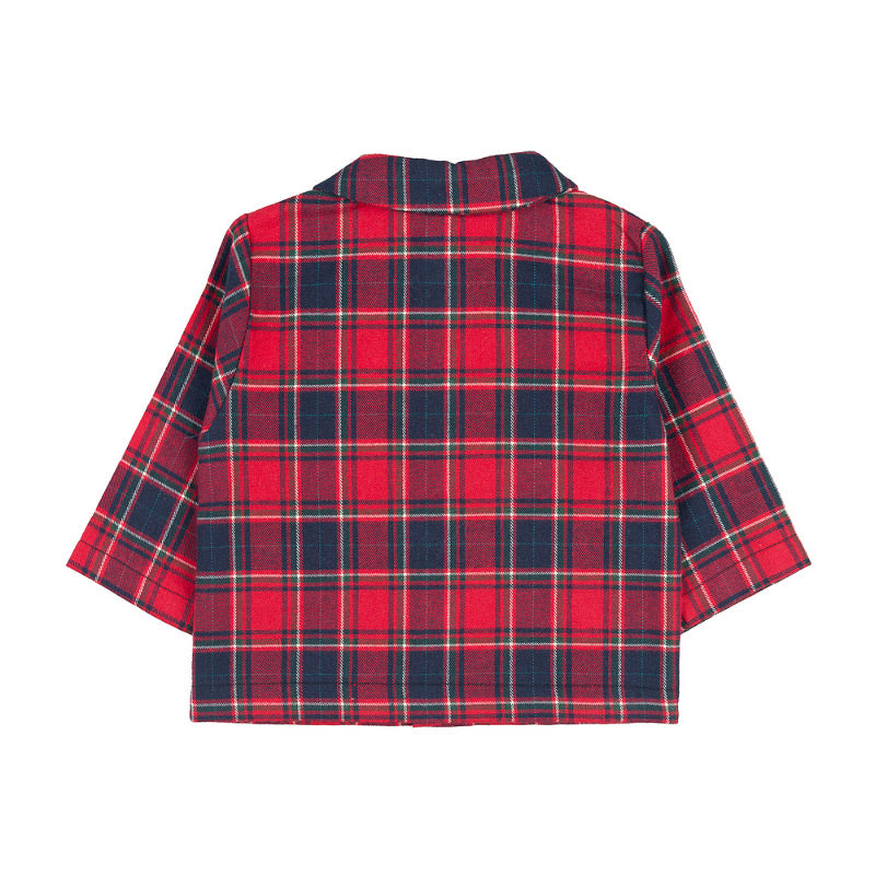 Pijama de dos piezas de estilo clásico y refinado. La camisa de manga larga presenta un cuello elegante y un lindo gráfico de osito de peluche impreso en el costado, para darle un toque afectuoso y divertido. El cierre frontal se vuelve práctico y colorido gracias a una hilera de botones rojos en contraste.