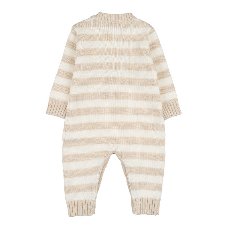 Graziosa tutina rigata beige, impreziosita da un tenero orsetto sul fronte.