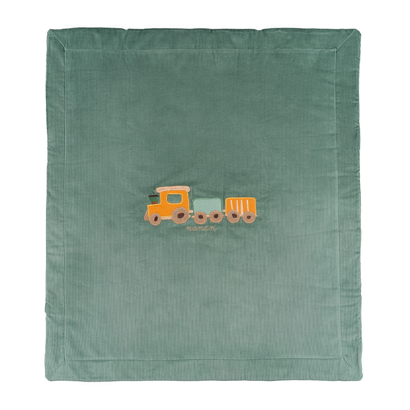 Morbida e avvolgente, questa copertina è realizzata in soffice velluto a costine, perfetta per coccolare il tuo bambino nei momenti di riposo. Al centro, un dolce ricamo raffigurante un trenino colorato dona un tocco giocoso e raffinato.