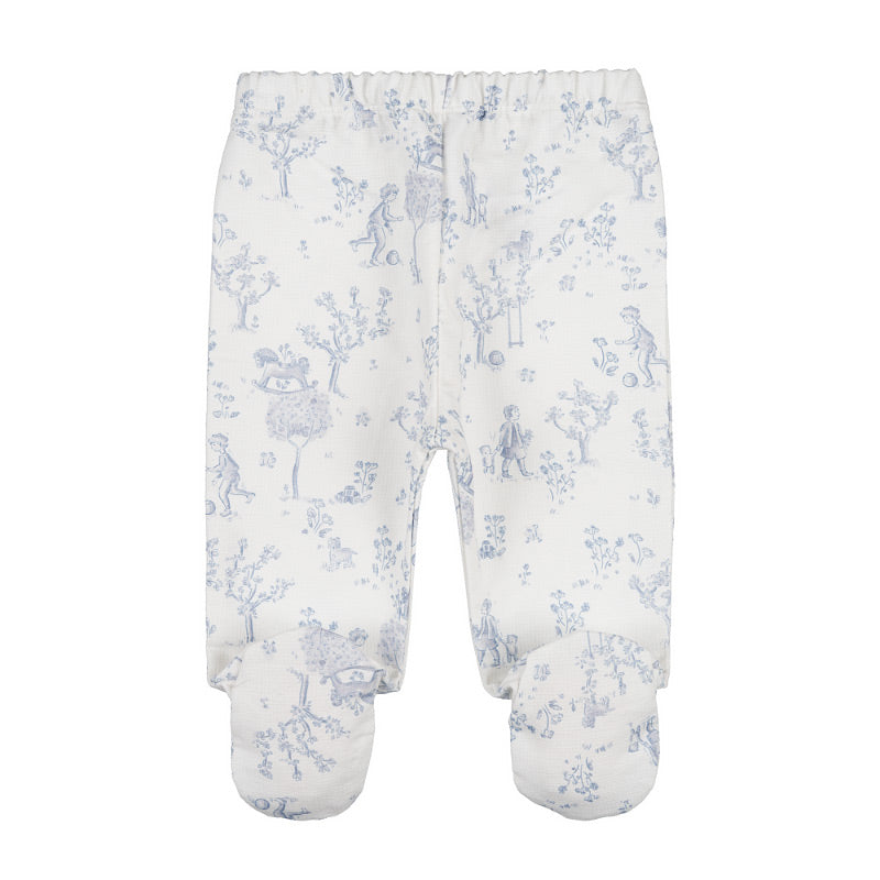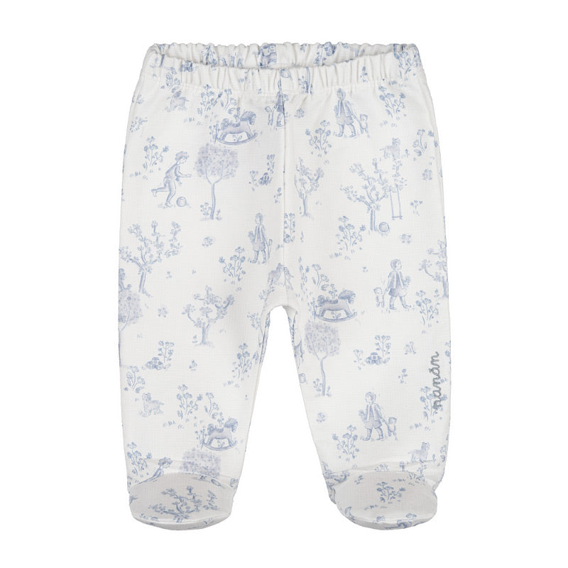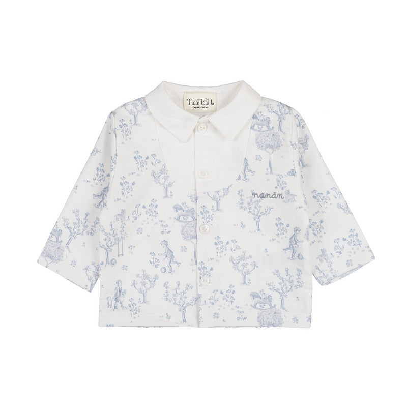 Jet à deux pièces en popline avec allover. La chemise avec col et le pallage blanc a un bronzage avant. Pantalon à vie élastique.