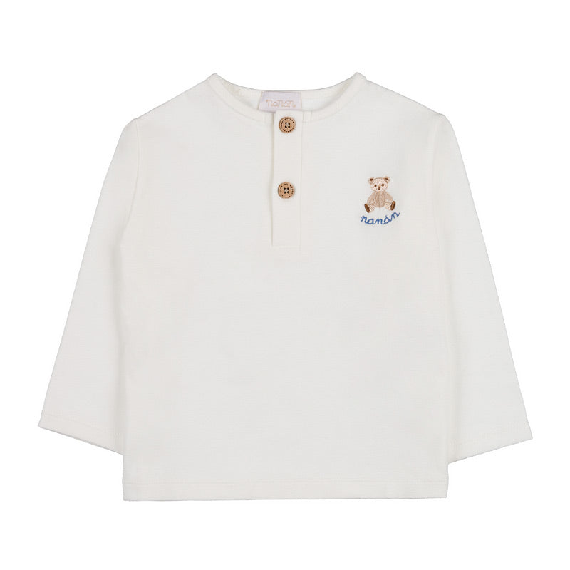 T-shirt a manica lunga realizzata in puro cotone e pensata per il comfort quotidiano dei più piccoli. Il colore bianco fa da sfondo a un tenero ricamo di orsetto sul petto, accompagnato dal logo “Nanán” in filo blu. L’apertura con due bottoni rende il capo facile da indossare.