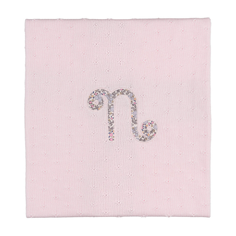 Couverture en fil rose avec bords et broderie au centre en tissu fleuri, doux et délicat.
