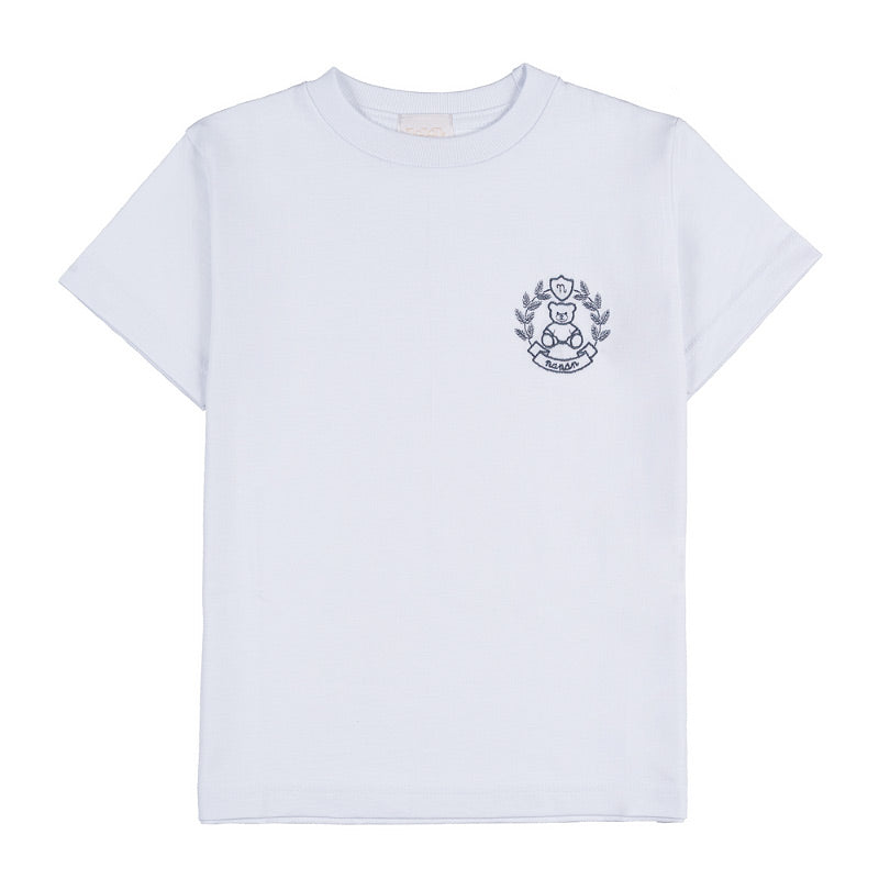 T-shirt a manica lunga realizzata in morbido cotone organico. Il modello, dal design semplice e raffinato, è impreziosito da un delicato ricamo affigurante un orsetto stilizzato all’interno di uno stemma con rami d’alloro. La chiusura con bottoncini sul davanti aggiunge un dettaglio pratico ed elegante, facilitando la vestizione.