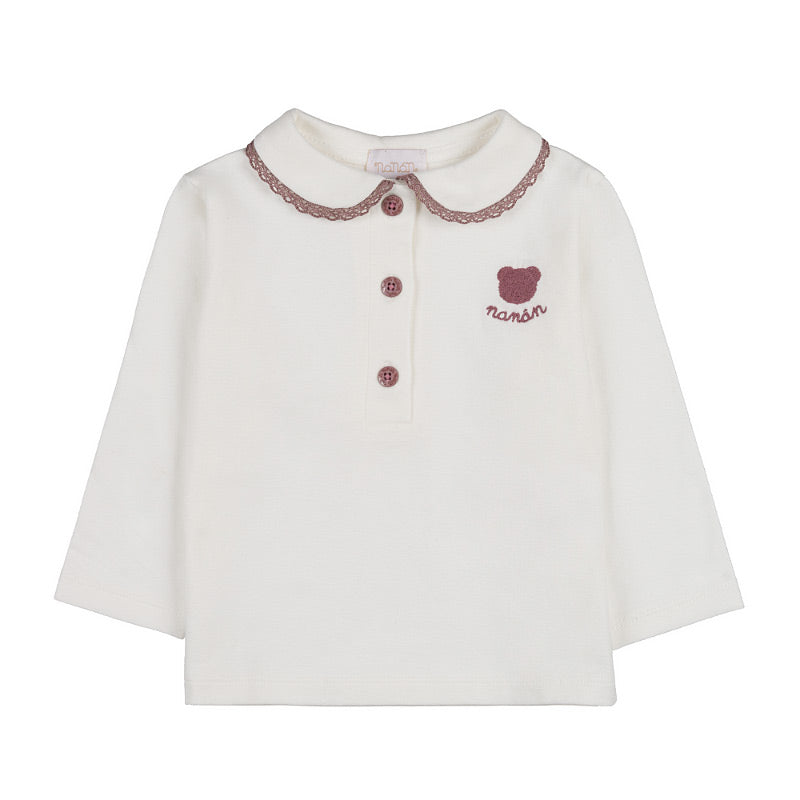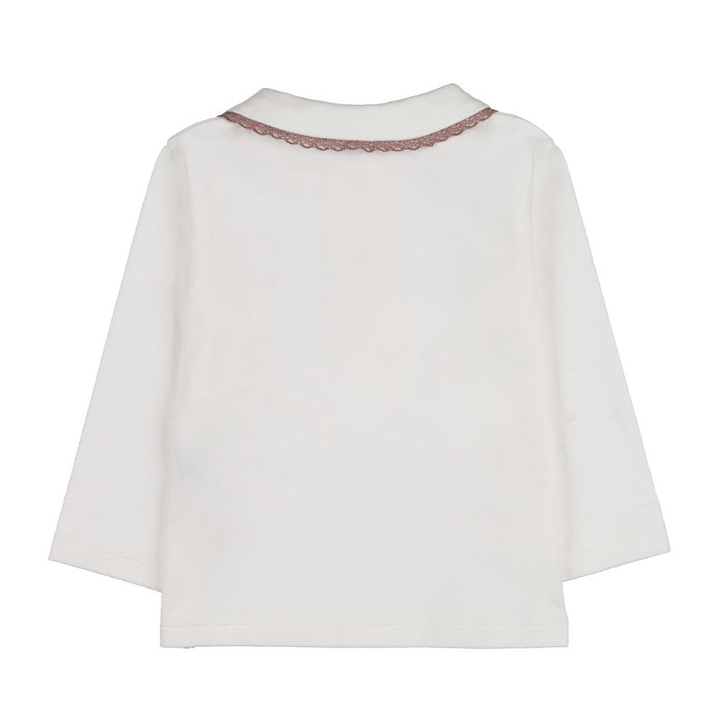 Un tocco romantico e tanta dolcezza per questa maglia a maniche lunghe. Il design è impreziosito da un raffinato colletto bianco tondo, decorato con un delicato merletto viola, che aggiunge un’eleganza senza tempo al capo.