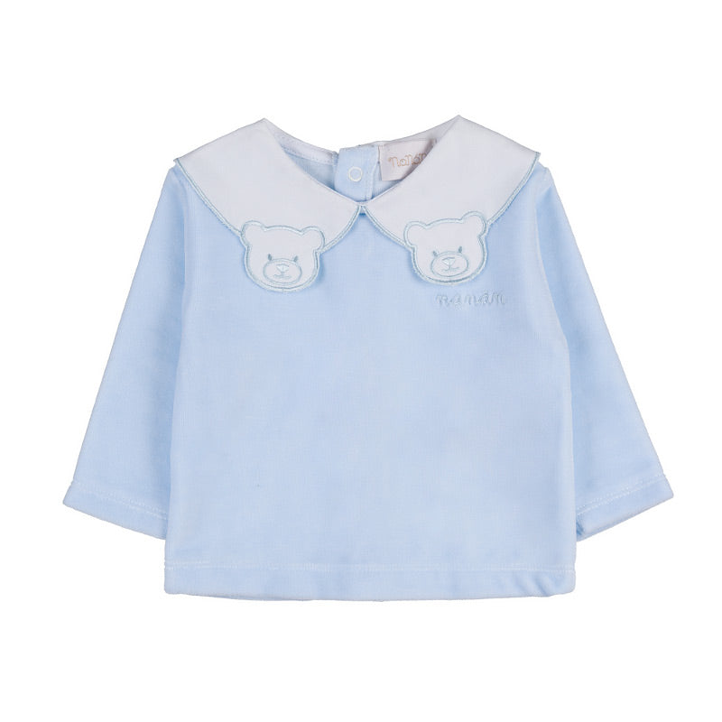 Graziosa tutina due pezzi con colletto con orsetti. Abbotonatura inferiore e frontale.