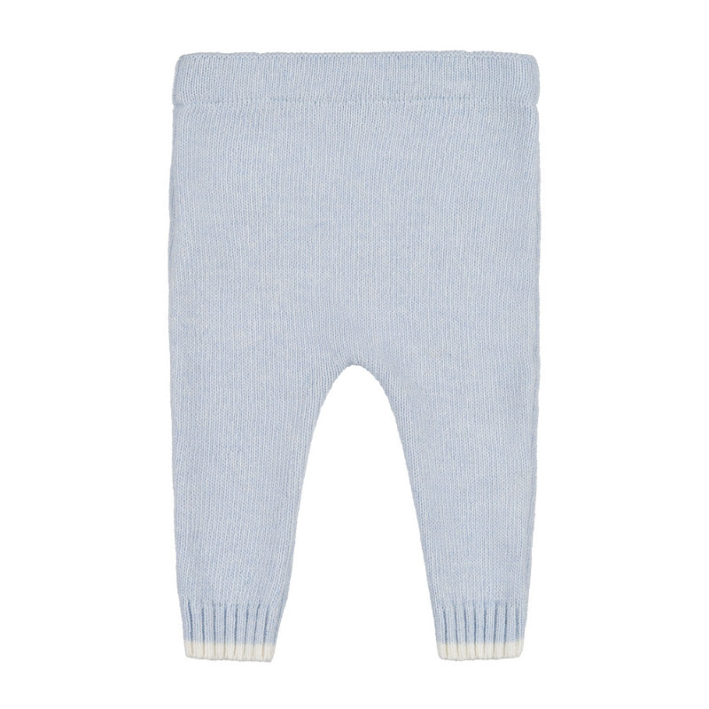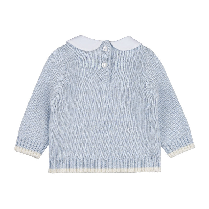 Tutina due pezzi da bebè in filo, rifinita da piccoli e graziosi ricami. Presenta un colletto tondo e un'apertura sul retro con bottoni color madreperla. Pantalone con vita elastica.