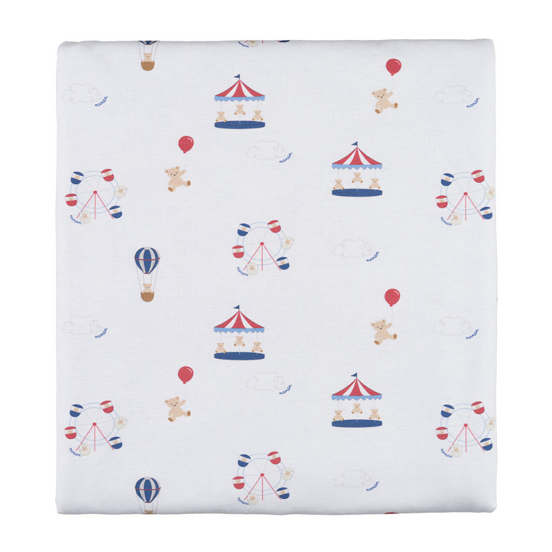 Prezzo normale €49,00Coperta ealizzata in morbido jersey, è perfetta per avvolgere il tuo bambino con dolcezza durante il riposo o le passeggiate. Il design presenta una simpatica fantasia a tema circo.