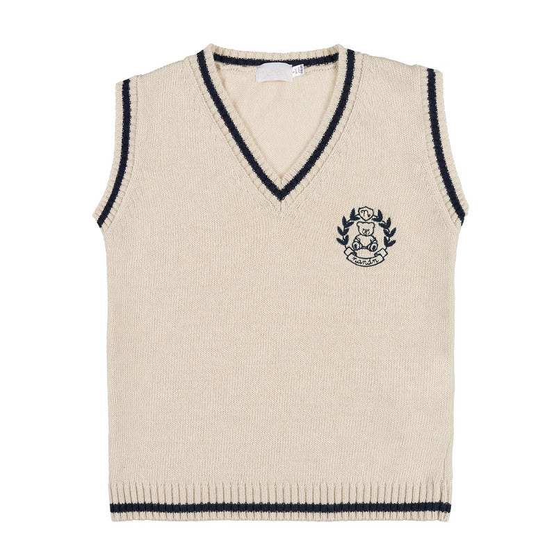 Gilet smanicato beige in maglia con orsetto